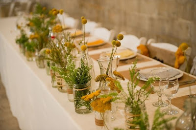 Buscamos algo que se integre muy bien en el espacio, una especie de pérgola, que ya tiene una preciosa enredadera y unas originales macetas con flores colgando de la pared que preside el espacio. Se trata de una reunión desenfadada y sobre todo muy fresca donde el plato principal va a ser un buen asado argentino. Se nos ocurre que lo mejor es mantener ese aire campestre y potenciarlo con los arreglos florales. Ya sabéis que al equipo de IDE@s nos encantan los arreglos aparentemente sencillos, que desprenden esa naturalidad de flores silvestres recogidas el mismo día en el campo y colocadas de manera espontánea en tarros de conserva o de mermelada de vidrio. Siempre se puede adornar el recipiente con cintas, cuerdas y telas de tejidos rústicos y naturales.